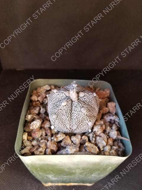 This hybrid of Astrophytum coahuilense x A. asterias shows characteristics intermediate between the two parents.